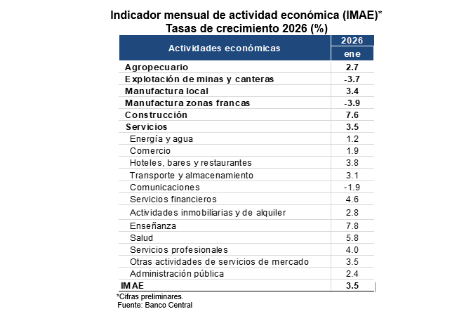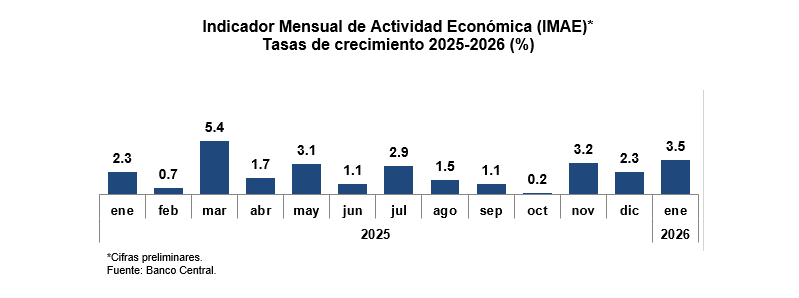 Las cifras preliminares del Indicador Mensual de Actividad Económica (IMAE) correspondientes al mes de enero de 2026 muestran una expansión interanual de 3.5 %, resultado principalmente del desempeño favorable del valor agregado real del sector construcción (7.6 %), manufactura local (3.4 %) y de las actividades del sector servicios en su conjunto (3.5 %). Dentro de estas últimas se destacan hoteles, bares y restaurantes (3.8 %), intermediación financiera, seguros y actividades conexas (4.6 %), enseñanza (7.8 %), salud (5.8 %), servicios profesionales (4.0 %) y otras actividades de servicios (3.5 %).