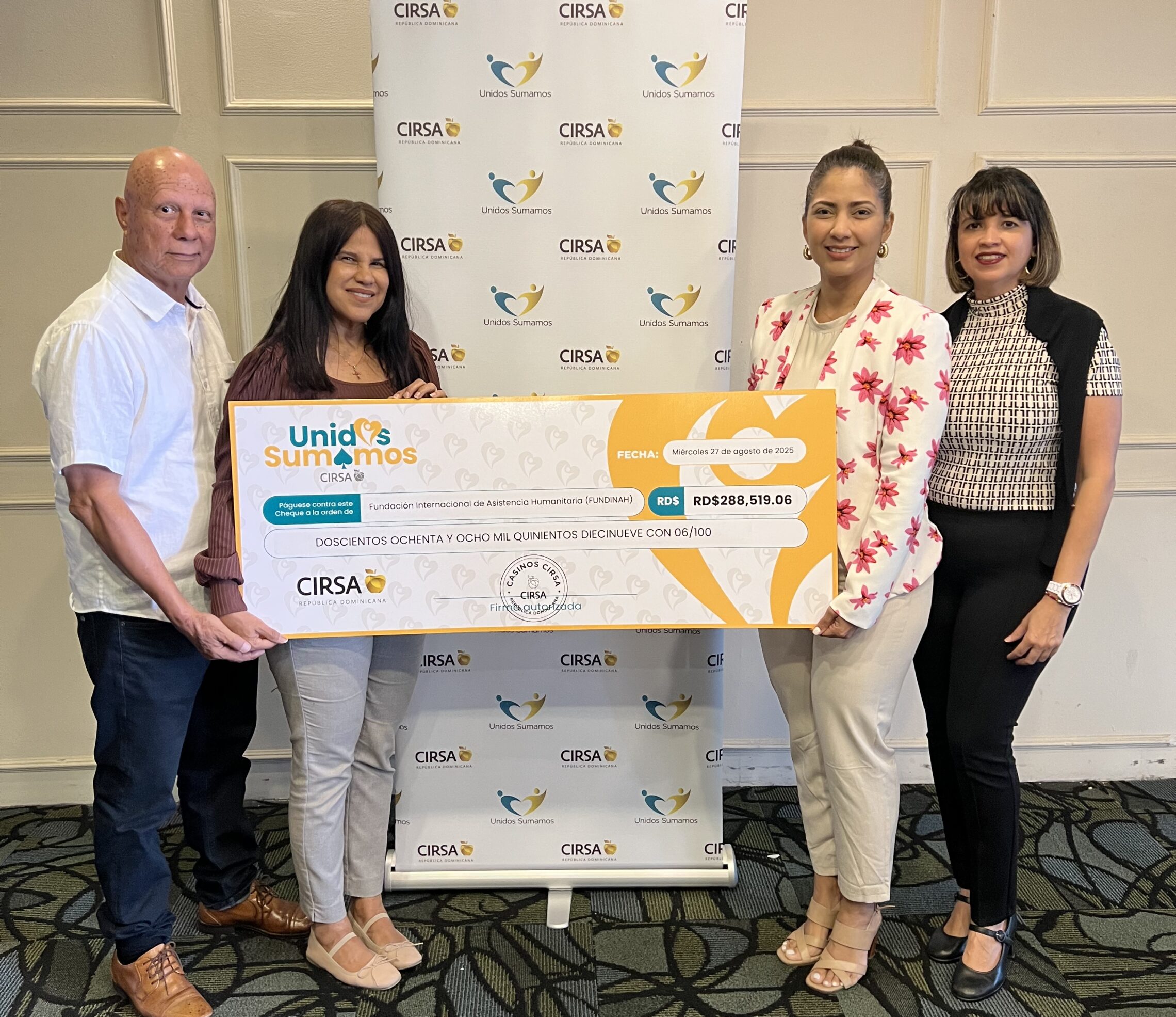 Santo Domingo, RD. — Como parte de su programa de responsabilidad social “Unidos Sumamos” y en una nueva muestra de su compromiso con el desarrollo de la sociedad dominicana, la compañía Cirsa RD entregó más de un millón de pesos a cuatro fundaciones que trabajan en favor de diferentes causas sociales en el país.