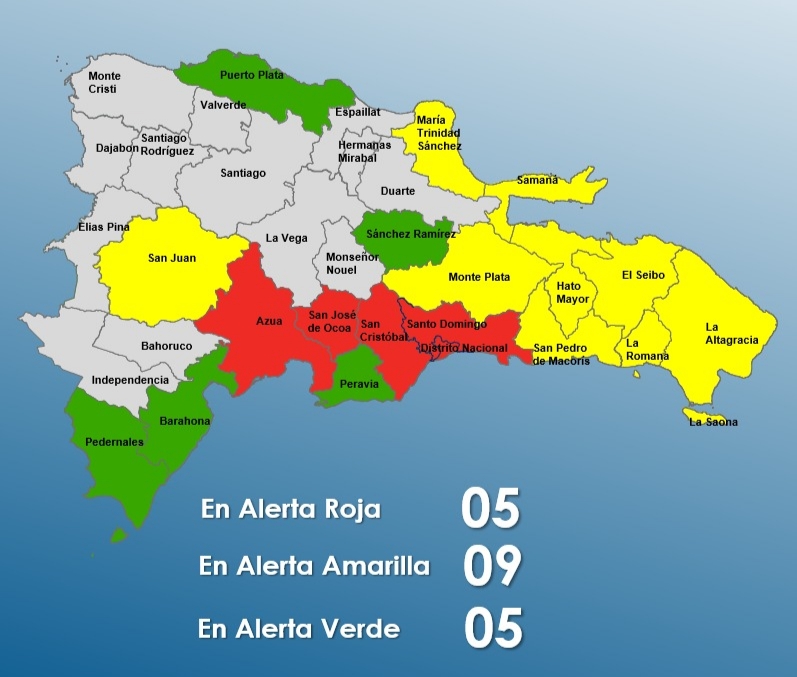 Mientras que en alerta amarilla se encuentran María Trinidad Sánchez, San Pedro de Macorís, El Seibo, San Juan, Monte Plata, La Altagracia, La Romana, Samaná y Hato Mayor.