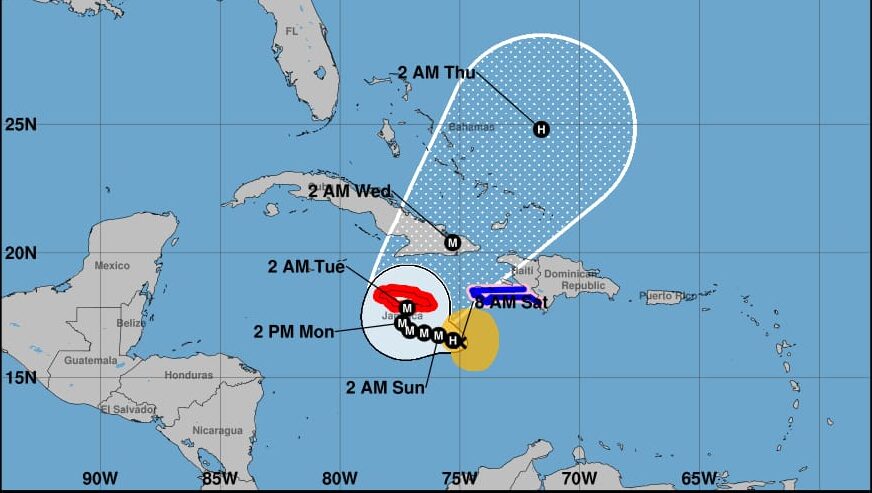 El organismo informó, que a las 8:00 a.m., de este sábado, la tormenta tropical Melissa se localizó a unos 375 kilómetros al suroeste de Puerto Príncipe, Haití, y a unos 260 km al sureste de Kingston, Jamaica. Se desplaza hacia el oeste/noroeste a unos 2 km/h y mantiene vientos máximos sostenidos de 110 km/h, con ráfagas superiores.