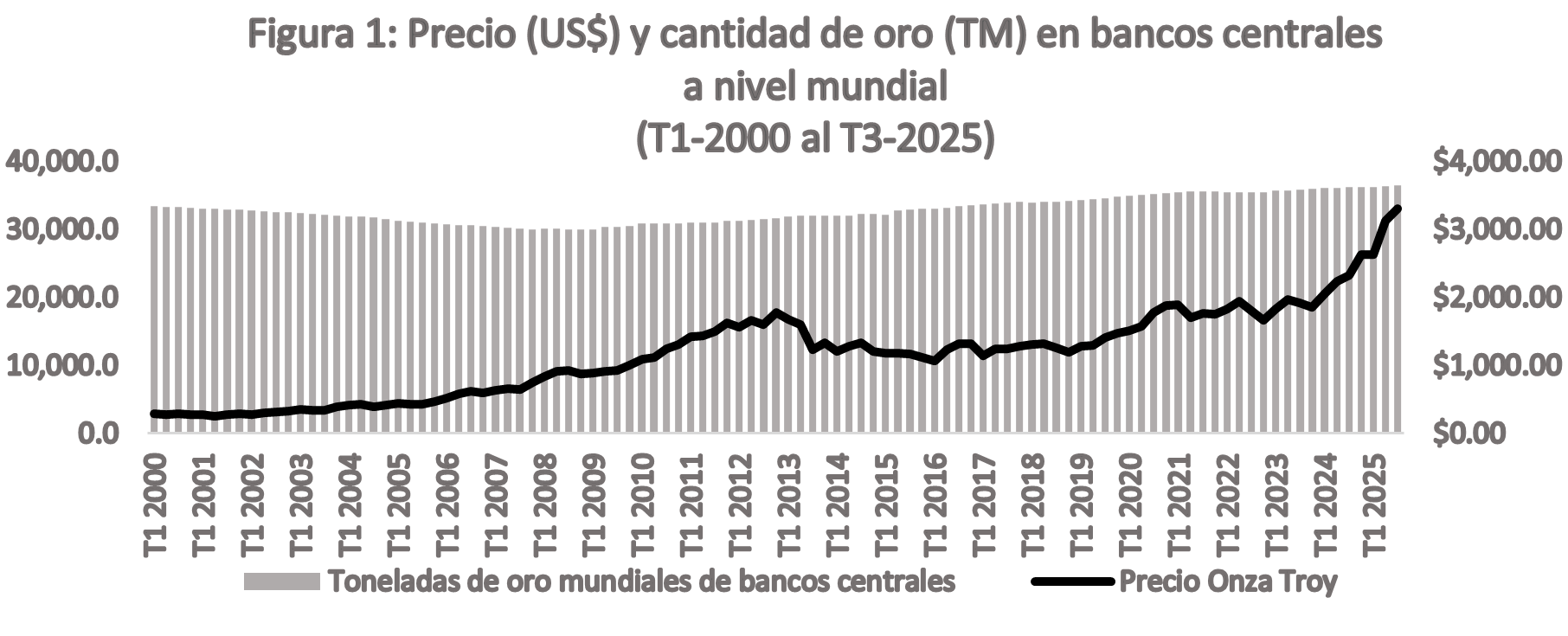 La evidencia internacional sugiere que, pese al renovado interés por el oro en el debate público, su participación dentro del total de reservas internacionales se ha mantenido relativamente estable a lo largo del tiempo. Aún cuando el precio del oro ha experimentado aumentos significativos en las últimas décadas, las tenencias de oro de los bancos centrales a nivel mundial, medidas en toneladas métricas, se han mantenido estables cercanas a un promedio de 32,800 toneladas métricas durante los últimos 25 años, registrando apenas un incremento aproximado del 10 % respecto al año 2000, como se observa en la figura 1.