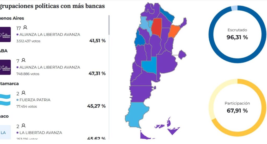 Con más del 40% de los votos, el oficialismo se impuso a nivel nacional y logró revertir el resultado en la provincia de Buenos Aires, donde apenas mes y medio antes había sufrido una derrota de más de 14 puntos. Según los datos parciales, La Libertad Avanza triunfó sobre Fuerza Patria, principal fuerza opositora peronista, que obtuvo poco más del 24%.
