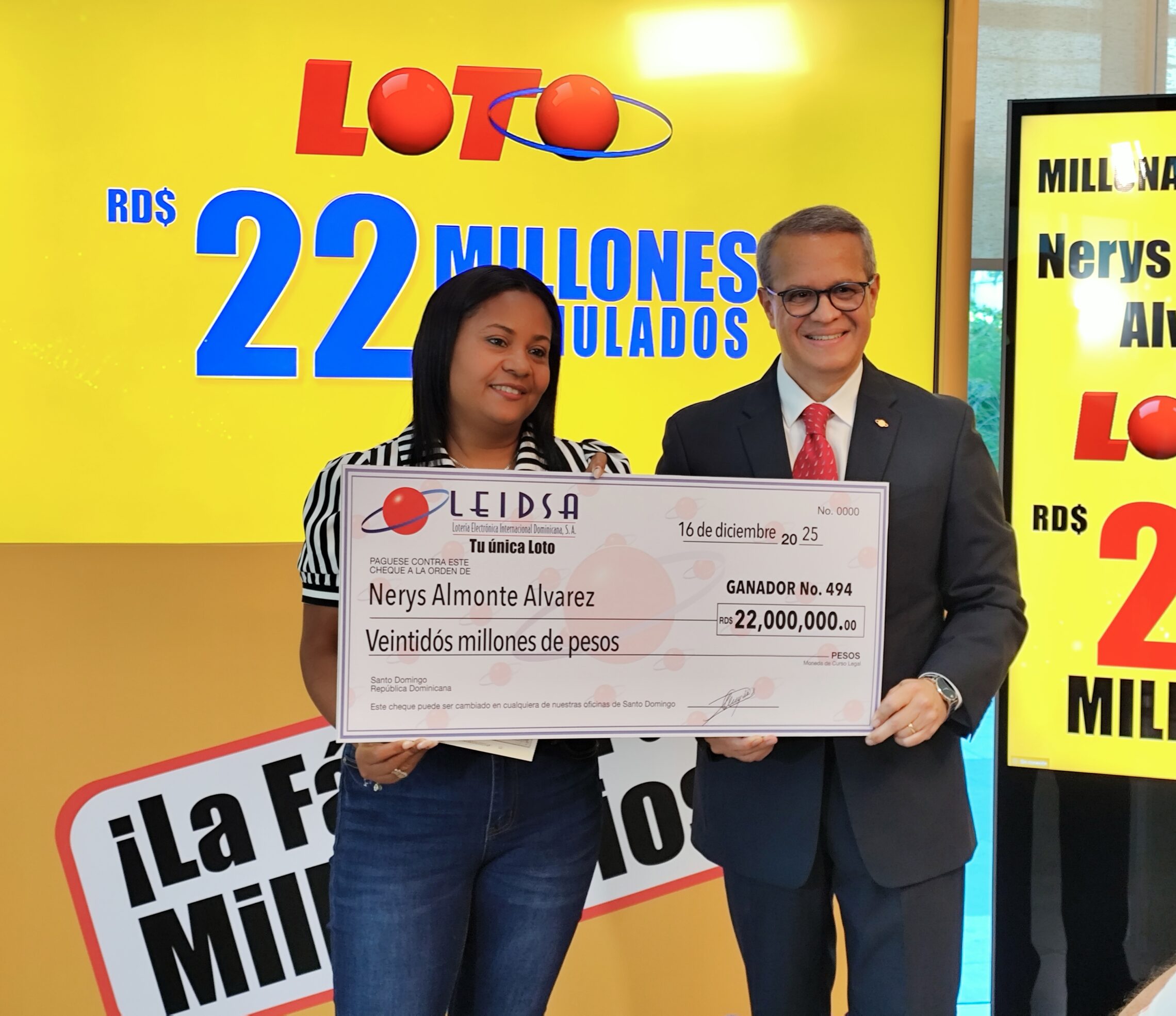 La Lotería Electrónica Internacional Dominicana S.A (LEIDSA) informó que la Sra. Nerys Almonte Álvarez recibió el cheque de 22 millones de pesos, tras resultar ganadora del sorteo del Loto el pasado sábado 22 de noviembre.