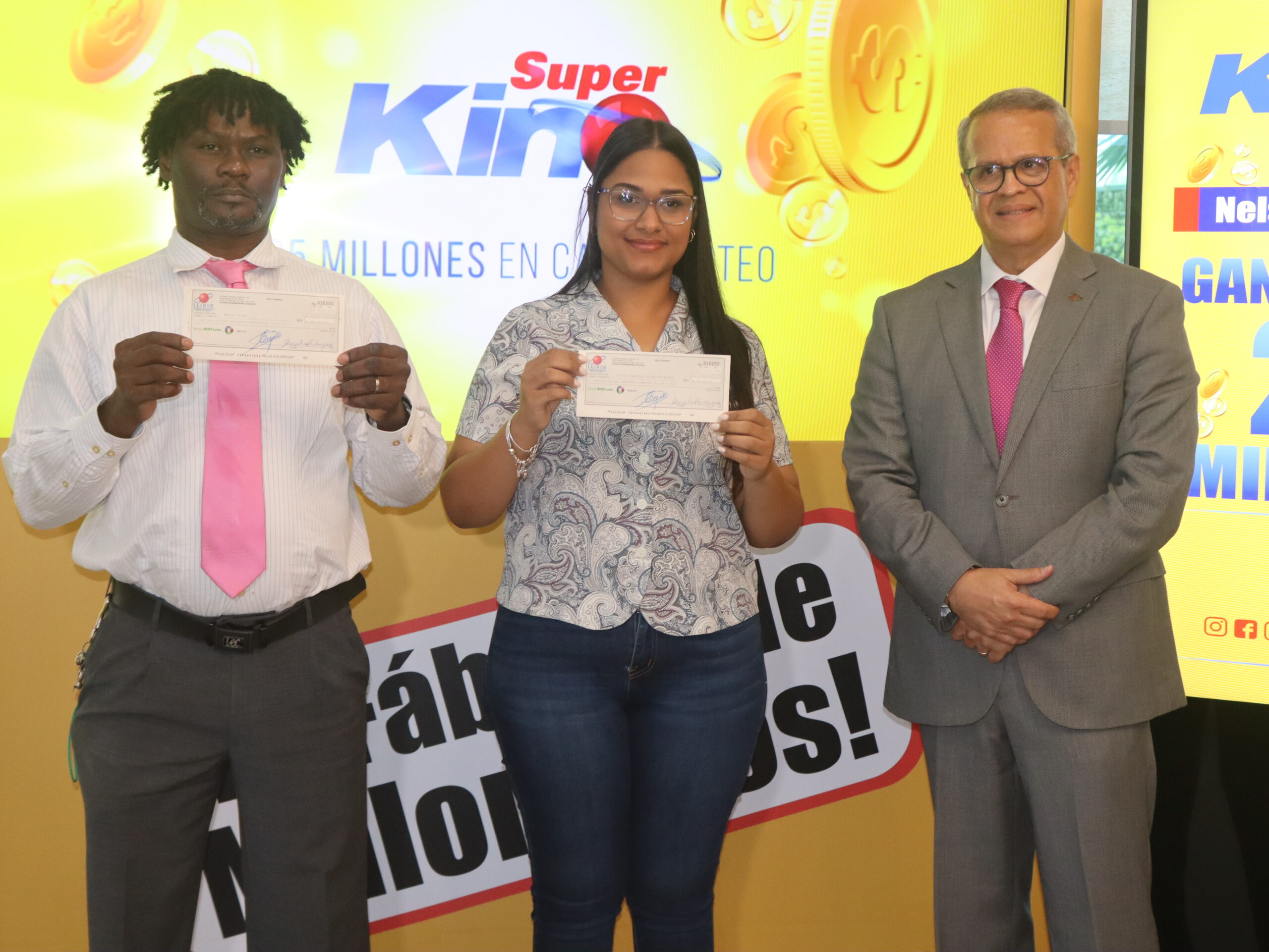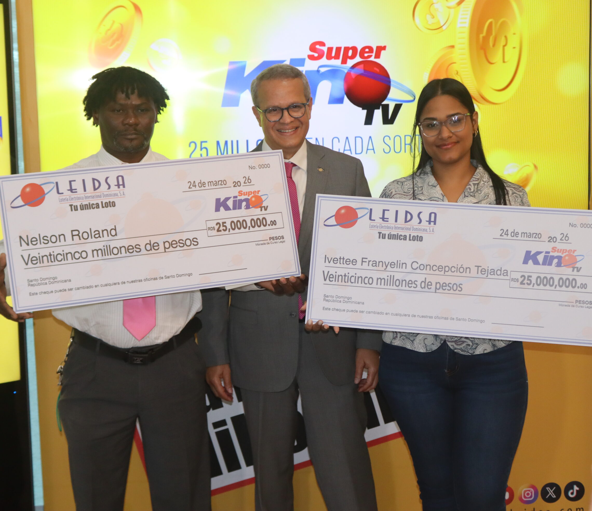 La Lotería Electrónica Internacional Dominicana, S.A. (LEIDSA), informó que entregó dos cheques de 25 millones de pesos cada uno, a los ganadores del Super Kino Tv, los señores: Ivettee Franyelin Concepción Tejada y a Nelson Roland.