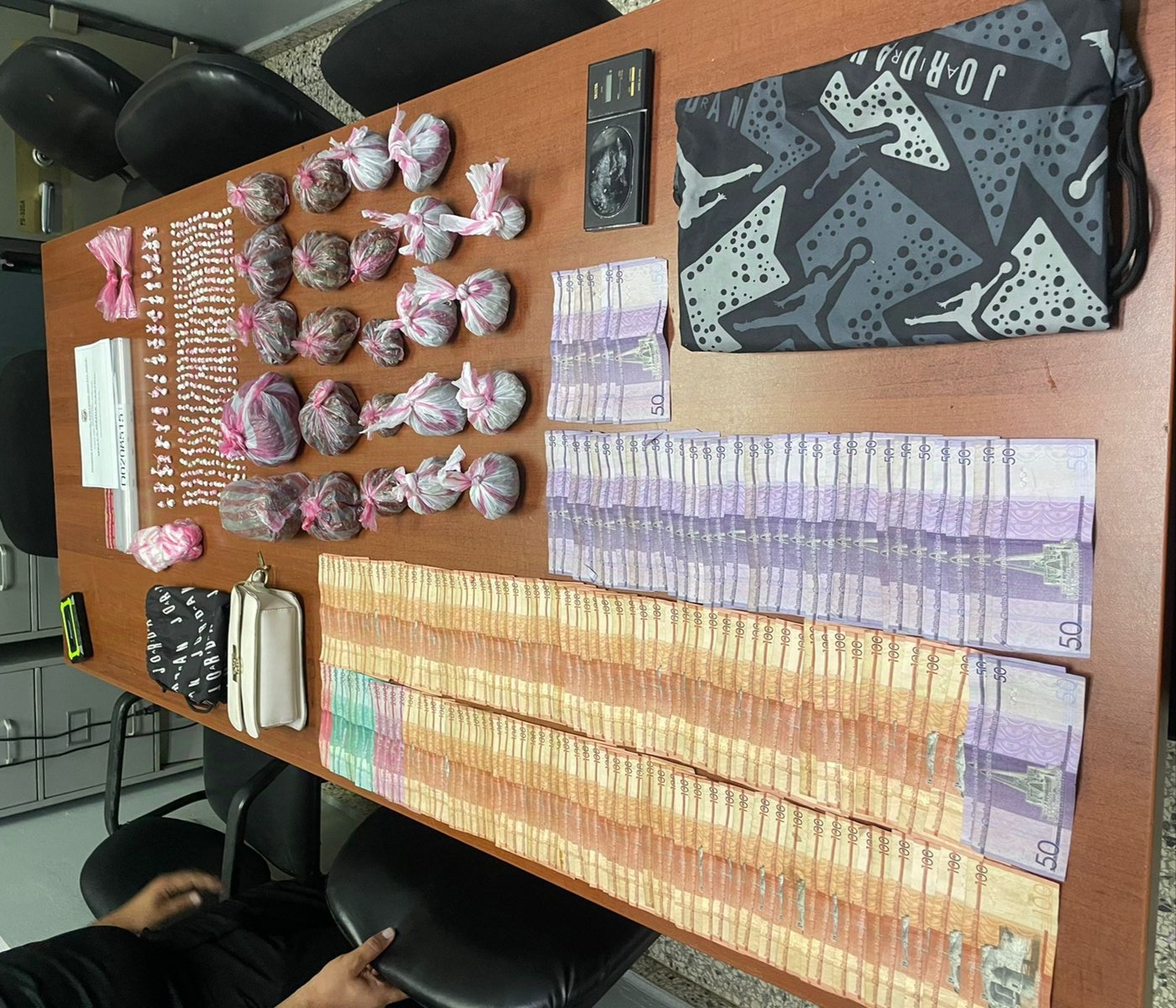 Durante la intervención, se decomisaron 2.5 libras de presunta marihuana, 20 porciones de presunto crack, 40 de cocaína, 24 porciones adicionales de marihuana, una balanza, 13 celulares y la suma de 18,450 pesos en efectivo.